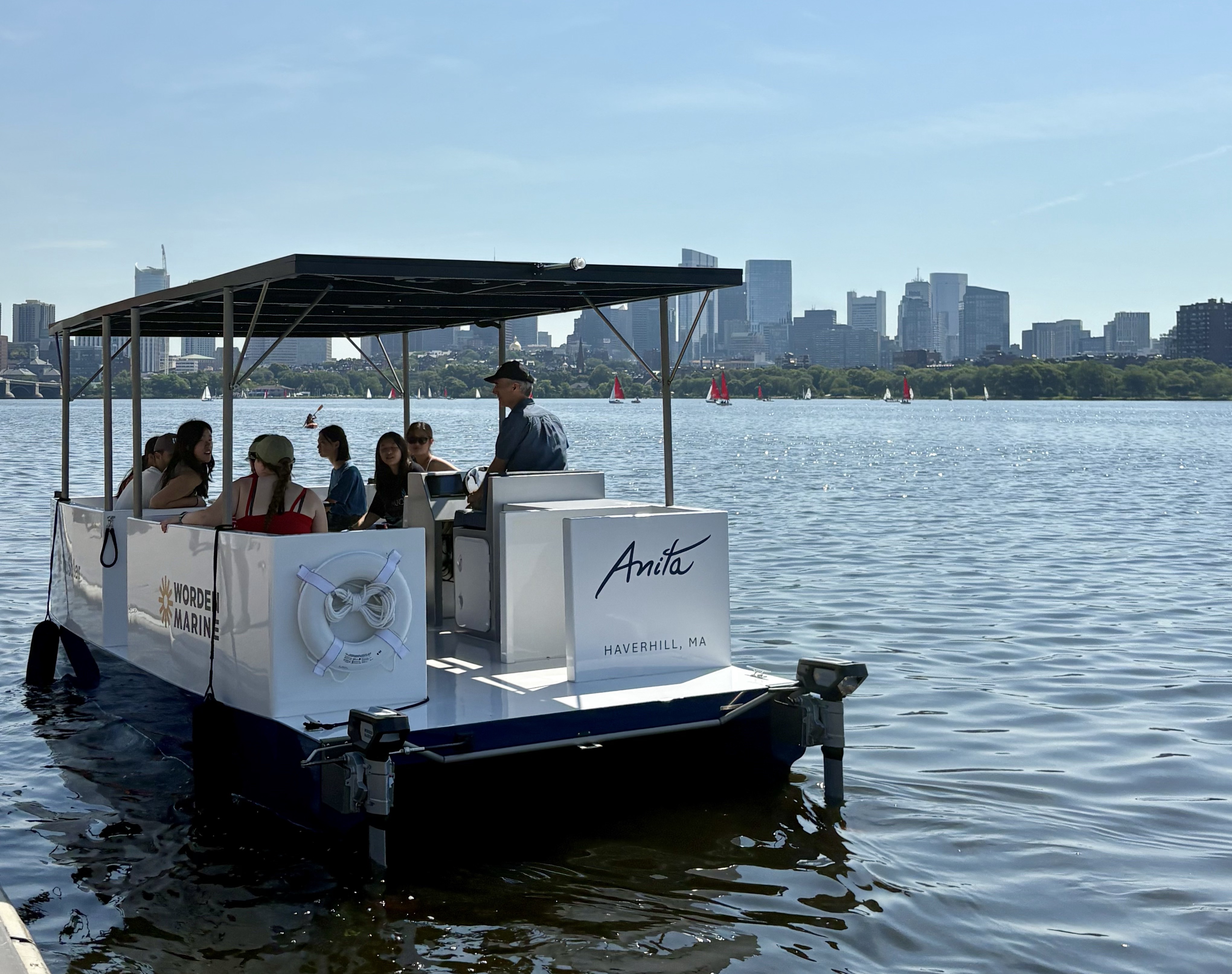 Then, it was time to see the solar boat in action. Visitors boarded in groups of six (the vessel can comfortably sit about 10), and settled into the cushioned bench seating lining either side of the craft. John Lagasse, the Engineering Manager at Worden Marine, gave those aboard a quick lesson in saluting (Lagasse is a US Air Force veteran), and unmoored the boat. Without a sound, the crew set off on the Charles River towards Boston.